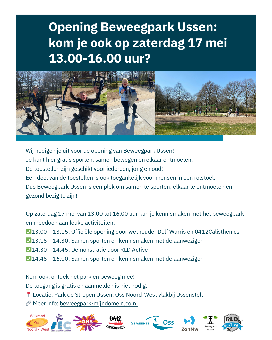 Wij nodigen je uit voor de opening van Beweegpark Ussen! Je kunt hier gratis sporten, samen bewegen en elkaar ontmoeten. De…